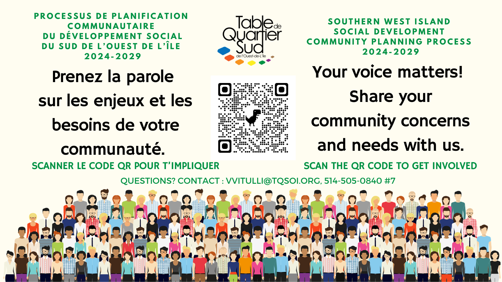 La Table de Quartier Sud de l’Ouest de l’Île (TQSOI) est un organisme communautaire à but non lucratif qui vise à améliorer la qualité de vie des citoyens du sud de l’Ouest de l’Île. Cette consultation publique est ouverte à tous les citoyens qui travaillent, vivent et étudient dans le sud de l'ouest de l'île (Baie D'Urfé, Beaconsfield, Dorval, Kirkland, Pointe-Claire, Sainte-Anne-de-Bellevue et Senneville) pour exprimer leurs préoccupations sur diverses problématiques et exprimer leurs besoins. C'est vous et votre communauté qui êtes à l'origine de l'ensemble de ce projet, c'est pourquoi toutes les contributions sont les bienvenues !